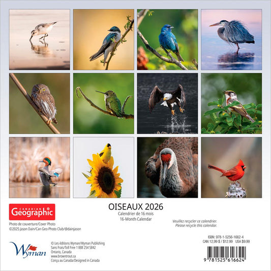 Canadian Geographic Oiseaux OFFICIEL | 2026 12 x 24 Inch (Hanging) Monthly Square Wall Calendar | Foil Stamped Cover | French Language
