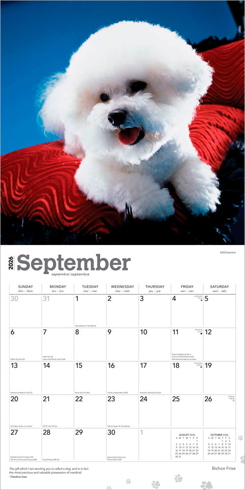 A happy little dog with white curly hair, the Bichon Frise always seems to be smiling. It may be small in stature, but it has a large presence. Devoted pets, these dogs are curious and playful. The Bichon gets along equally well with people and animals, and is considered one of the gentlest dogs. Fans of this charming Mediterranean breed will definitely enjoy this adorable Bichon Frise calendar.
