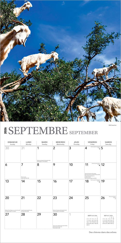 Des chèvres dans des arbres | 2026 12 x 24 Inch (Hanging) Monthly Square Wall Calendar | French Language