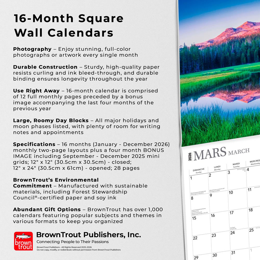 This square wall calendar is the ideal way to bring stunning photos and designs into your home–or as a gift for friends and family. The 12" x 12" calendar opens to a tall, 24-inch calendar to grace your wall with wonderful images of your favorite passion. Dated January to December, it also includes a bonus mini-calendar page of September to December of the previous year to give you a jump start on planning. Monthly grids allow ample space for writing daily tasks and appointments, and includes all major holidays. You can purchase with the reassurance that all components are recyclable.