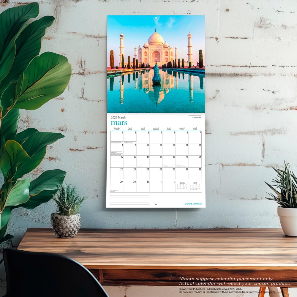 J'adore voyager | 2026 12 x 24 Inch (Hanging) Monthly Square Wall Calendar | French Language