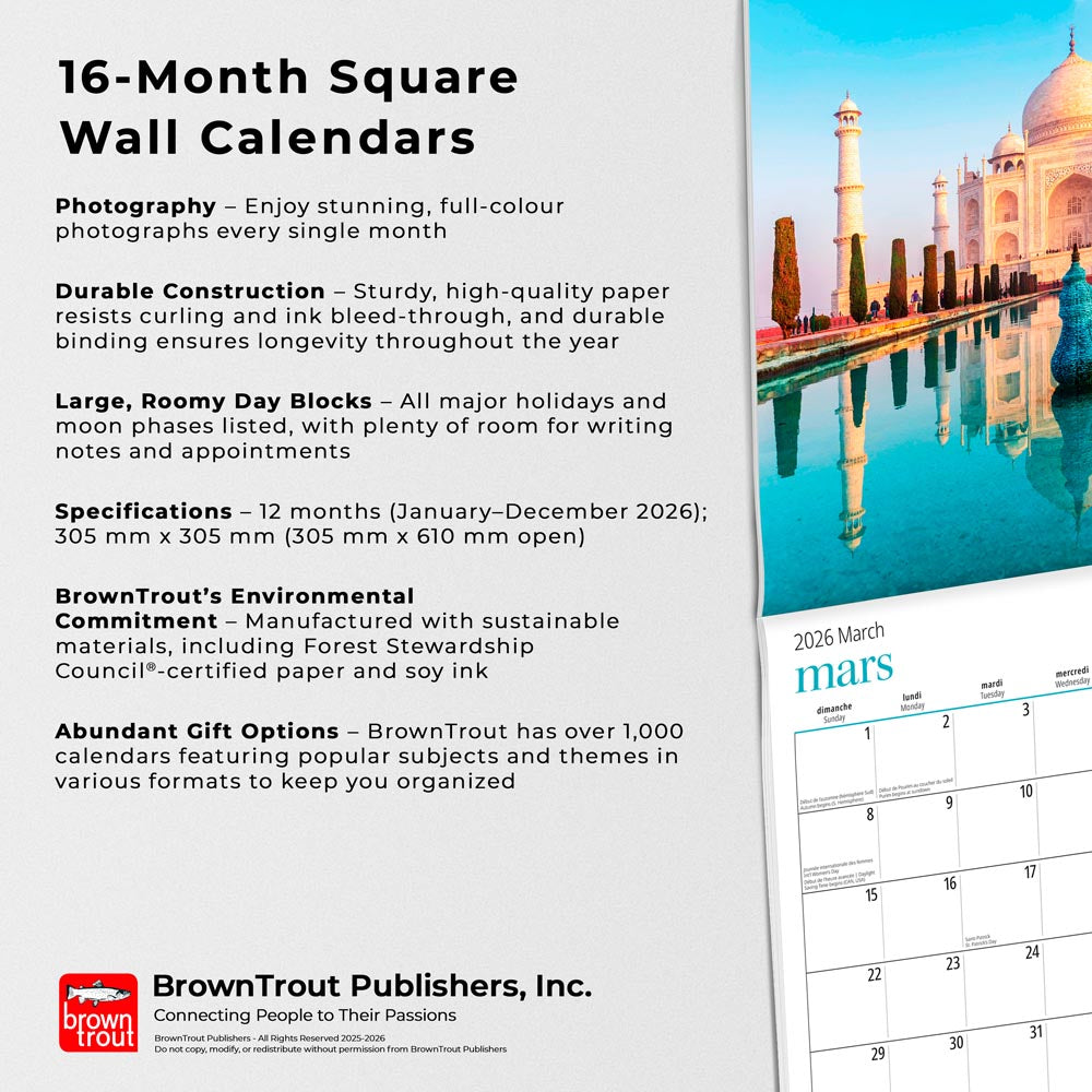 The 305 mm x 305 mm (305 mm x 610 mm open) saddle-stitched horizontal/landscape format wall calendar comes shrink wrapped with a cardboard stiffener to decrease the risk of damage in transit, as well as a mailing envelope to send the calendar as a gift. Includes a drill hole so you can hang the calendar on your wall. Includes Australian, New Zealand, and international public holidays, school-term dates for Australia and New Zealand, and a bonus 2026 Year Planner. Each month displays a mini datepad as reference to the previous and next months, Southern Hemisphere moon phases, and image captions throughout. This is a 12-month calendar–for January to December 2026–and is printed on 250 gsm gloss art stock for cover and 150 gsm gloss art stock for internal pages. BrownTrout honours its commitment to sustainability by choosing FSC-certified paper, soy- and vegetable-based inks, and a digital workflow, and is committed to ensuring ethical trade manufacturing standards.