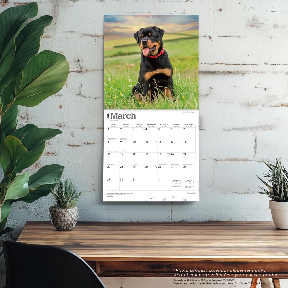 Intelligent and loyal, the Rottweiler is both a guardian and friend. A hardworking dog, it has a confident, calm, and reliable demeanor to go along with its exceptionally powerful physique. These dogs are incredibly affectionate and loyal to their human companions. Originating from Rottweil, Germany, Rottweilers are hardworking and extremely intelligent, bringing joy to people all over the world. Rottweiler fans will enjoy this fabulous calendar.