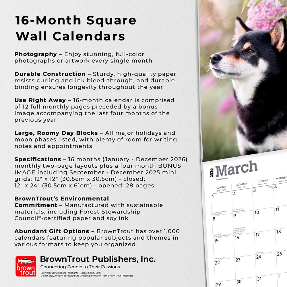 Shiba Inu | 2026 12 x 24 Inch (Hanging) Monthly Square Wall Calendar