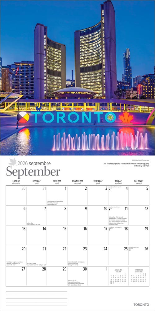 The largest of Canada's great cities, Toronto has so much to offer in the way of architecture, entertainment and sport. It makes the most of its natural terrain, with cool treed parks along the winding Don and Humber rivers, and beaches on Lake Ontario. This square wall calendar is produced in English.