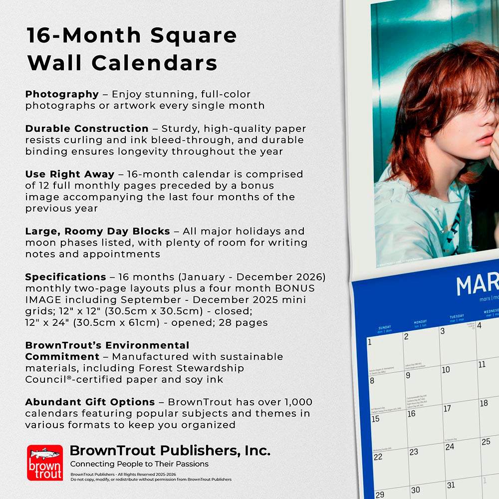 This newly re-designed square wall calendar is an even better way to bring stunning photos and graphic art into your home, or as a gift for your favorite person. The new and improved 12" x 12" calendar is bound in a distinctive wrap-around cover made of an even heavier-duty stock paper than before. All of this opens to a tall, 24-inch calendar to grace your wall with the best images of your favorite passion. Dated January to December, it also includes a bonus, four-month mini calendar page of September to December of the previous year to give you a jump start on planning. Monthly grids allow ample space for writing daily tasks and appointments, and includes all major holidays. You can purchase with the reassurance that all components are recyclable.